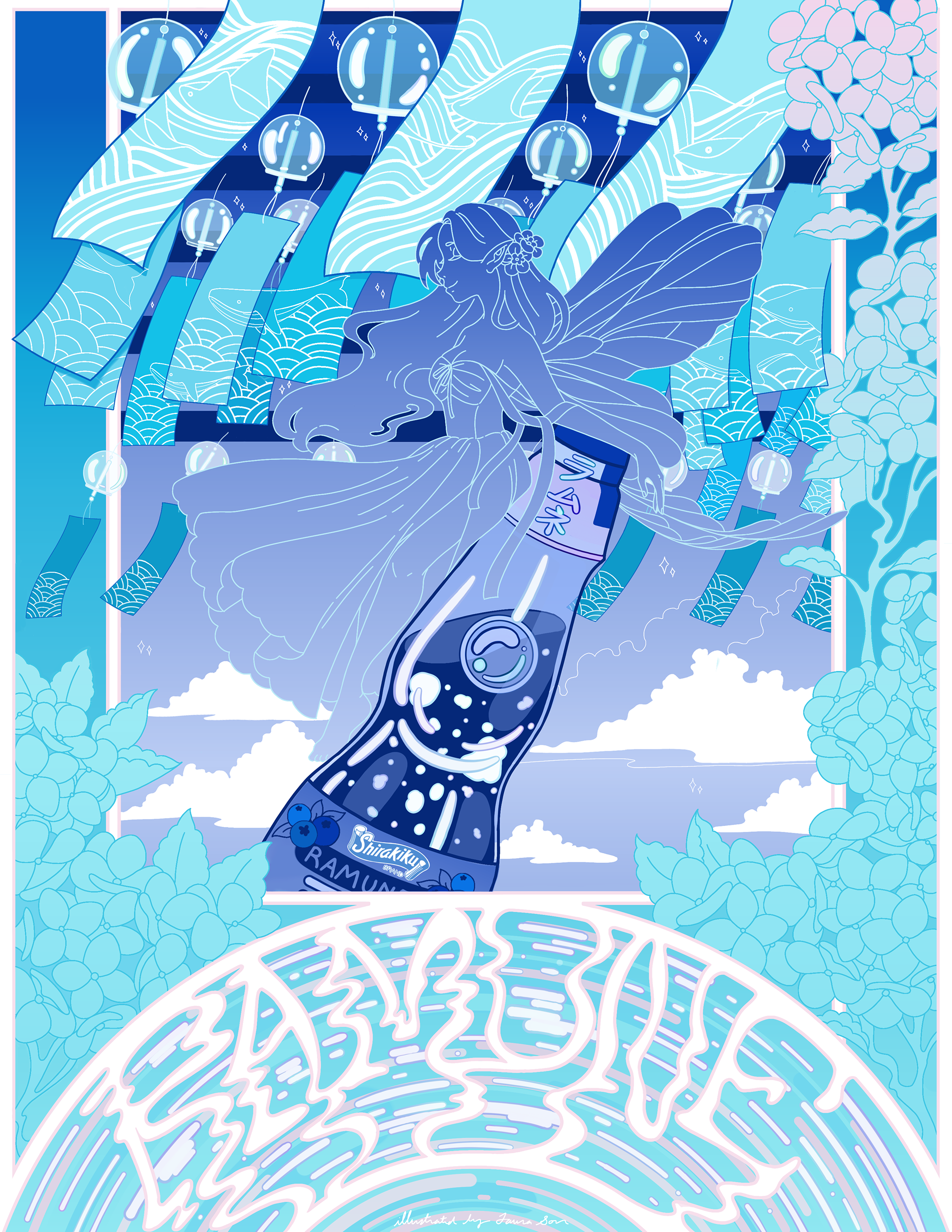 For the redesign, the poster would feature a fairy sitting serenely on top of an unopened bottle while listening to the wind chimes in the background. I replaced the sunflowers with hydrangeas for the framing and the stiff typefaces with fluid, rippling letterings that spelled "Ramune."